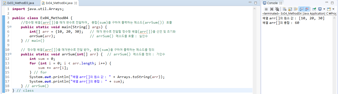 - 배열의 원소들을 나열할때는 Arrays.toString() 메소드를 사용한다.