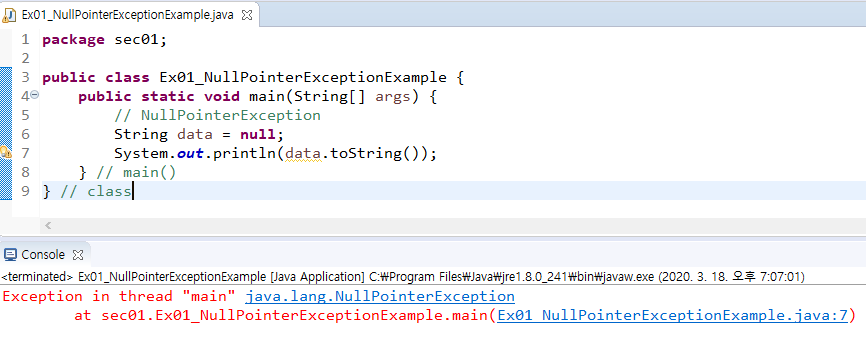 - 가장 빈번하게 발생하는 실행 예외로, 객체가 없는 상태에서 객체를 사용하려 할 때 예외가 발생한다.