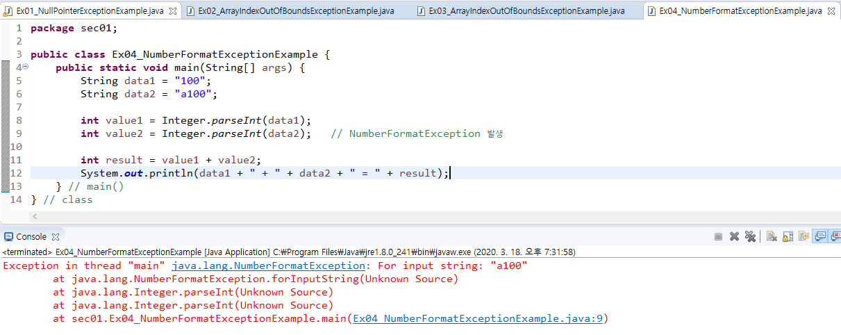 - data2 변수의 문자열 "a100"은 숫자로 변환할 수 없기 때문에 9라인에서 예외가 발생한다.
