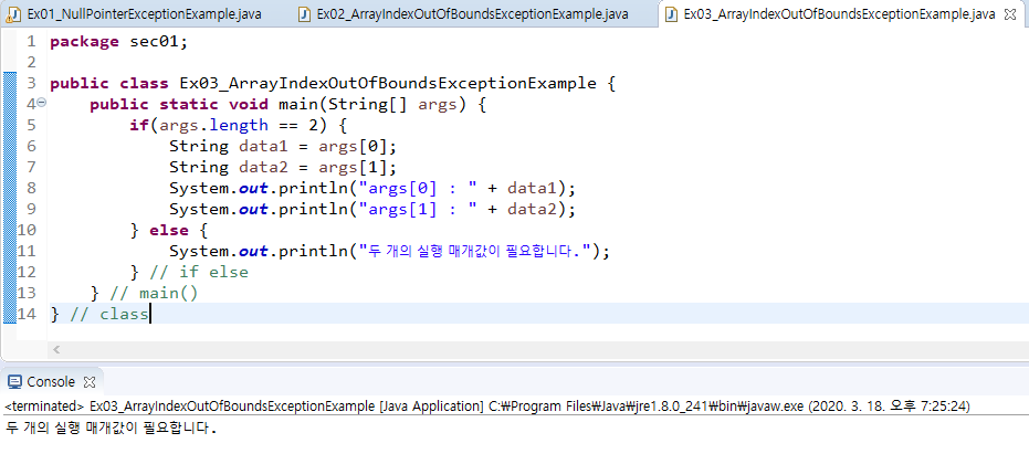 - 배열값을 읽기 전에 배열의 길이를 먼저 조사한 뒤, 실행 매개값이 없거나 부족할 경우 조건문을 이용해서 사용자에게 알려준다.