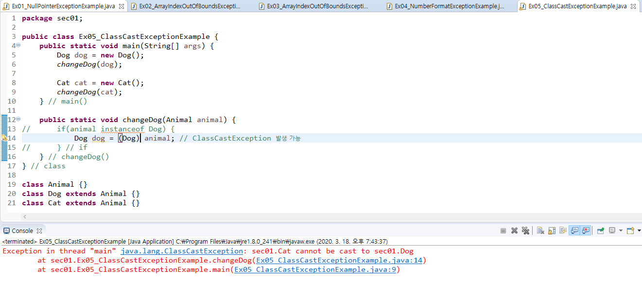- 9라인에서 Cat 객체를 매개값으로 주어서 Dog 타입으로 변환할 수 없다.