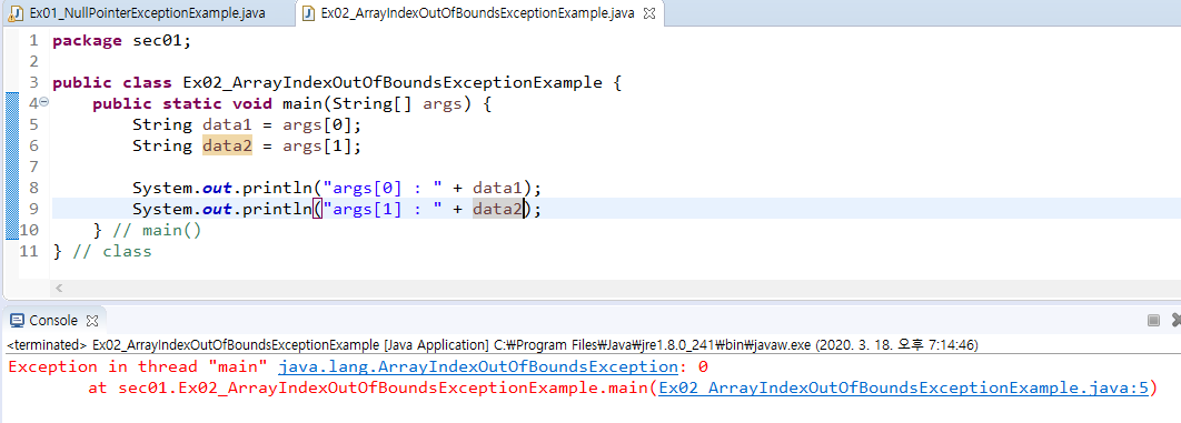 - 2개의 실행 매개값을 주지 않았기 때문에 args[0], args[1]과 같이 인덱스를 사용할 수 없다.