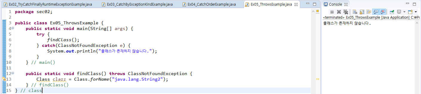 - throws가 붙어 있는 메소드는 반드시 try 블록 내에서 호출되어야 하고 catch 블록에서 넘겨 받은 예외를 처리해야 한다.