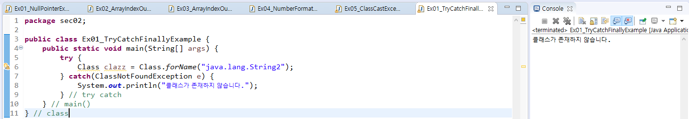 - 6라인에서 예외가 발생되면 7라인을 실행해서 예외처리를 한다.