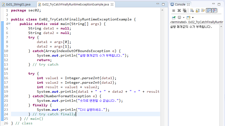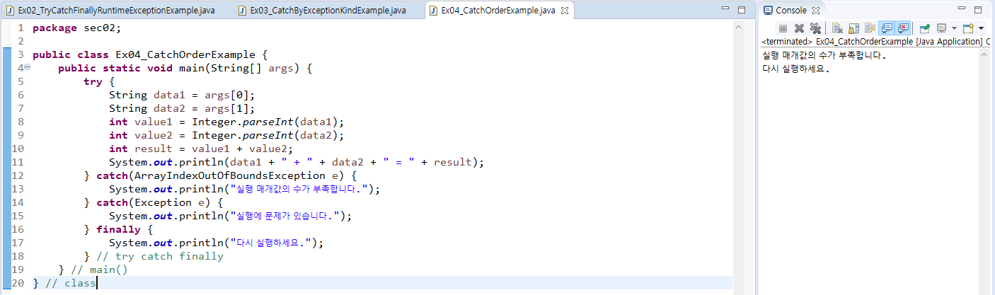 - 실행 매개 값을 주지 않아서 8라인에서 예외가 발생되면 10 ~ 12라인을 실행해서 예외 처리한다.
