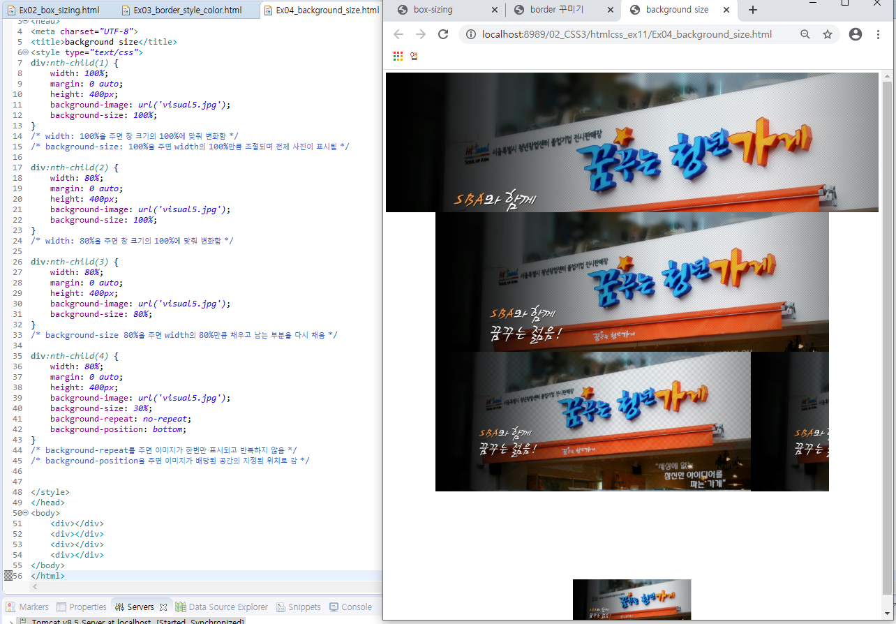 - background-repeat 생략하면 repeat가 기본값, no-repat는 반복 안됨