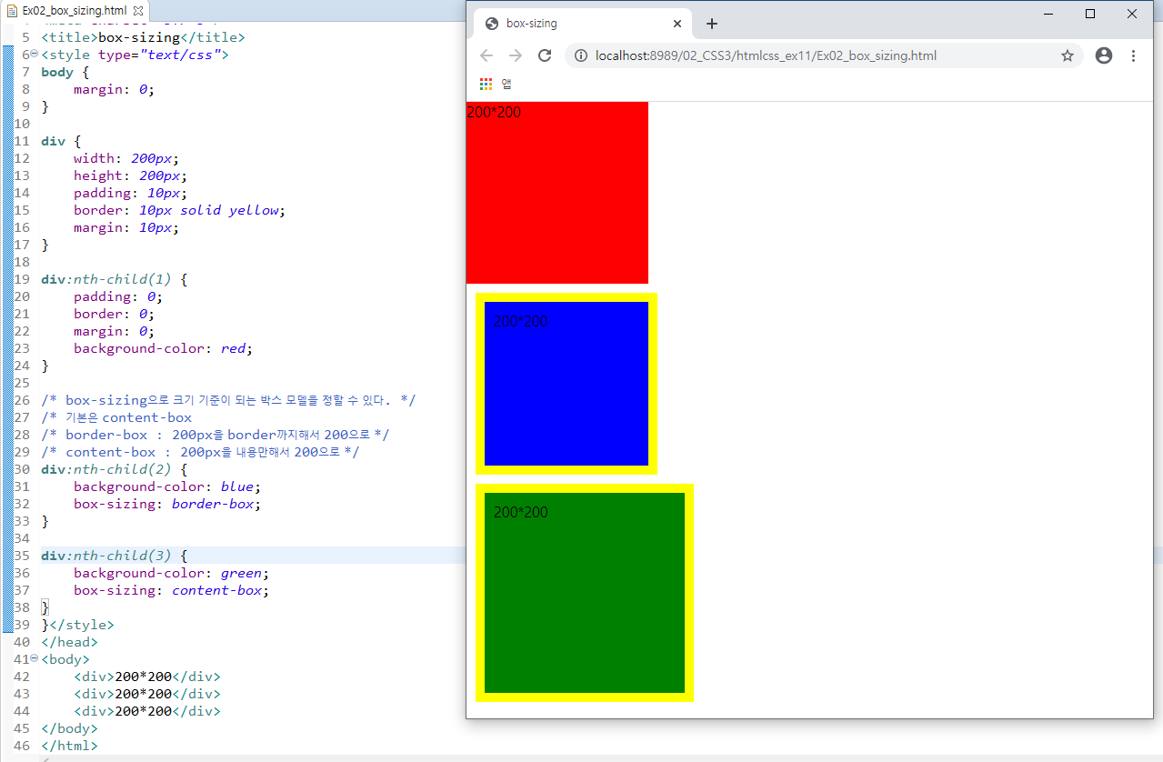 - border-box는 border와 padding 모두 box 안쪽으로 간다.