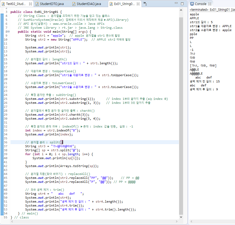 - JAVA에서는 String 클래스를 편리하게 사용하기 위한 여러 메서드들을 제공한다.