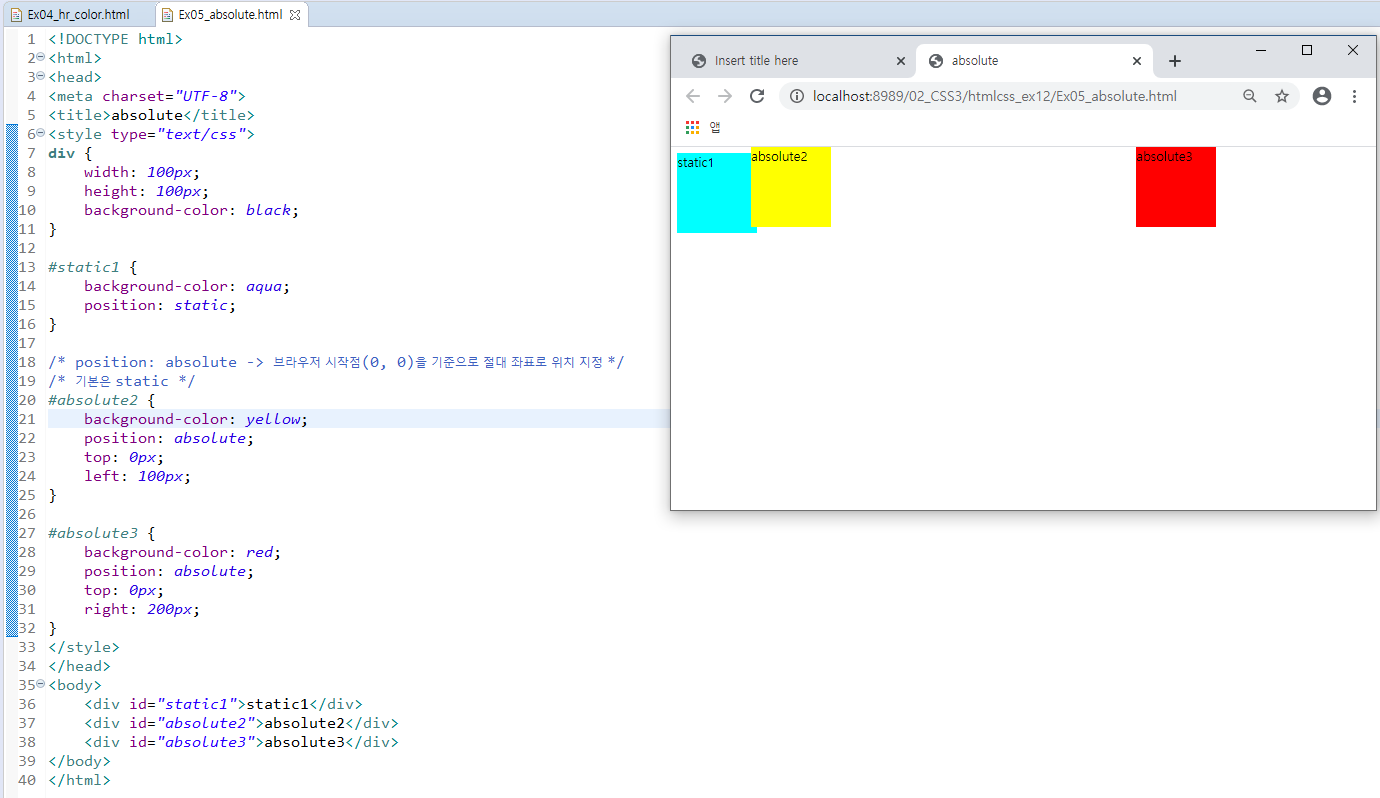 - position: absolute를 주면 브라우저 시작점(0, 0)을 기준으로 절대 좌표로 위치를 지정할 수 있다.