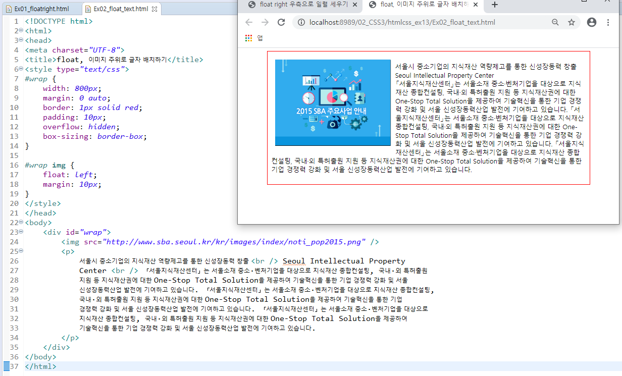 - 이미지에 float 속성을 줌으로써 주위에 글자를 배치할 수 있다.