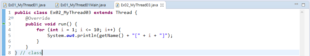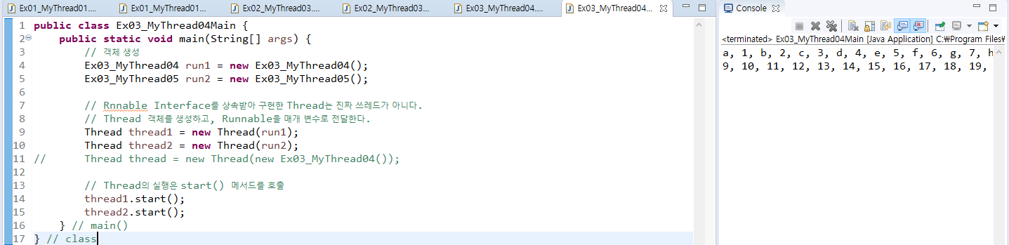 - 하나의 클래스의 객체를 여러 개 생성하고 스레드를 이용하면 하나의 클래스를 동시에 실행할 수 있다.